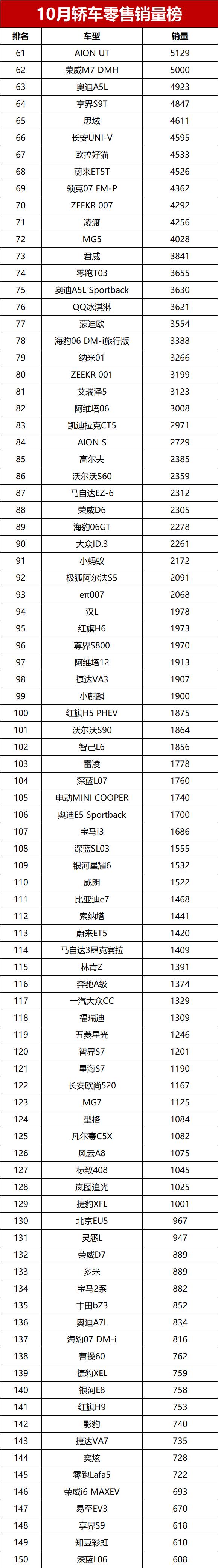 长安 逸动 夺得国产燃油轿车销冠,10月份以14983辆的销量排名第23位; 红旗H5 紧随其后,以14769辆的销量排名第24位; 艾瑞泽8 排名第27位,本月销量13669辆。