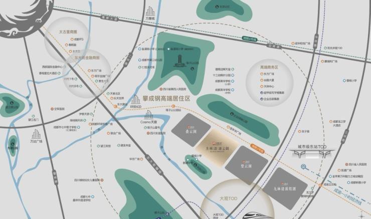 【生态配套】双公园环伺,中央公园住区距项目1公里——400余亩塔子山公园+125亩东站绿轴公园盛景,市区最大的综合公园,东二环区域心脏位置。距项目3公里——3000亩成都最大青龙湖湿地公园,贴近自然的主城理想生活。