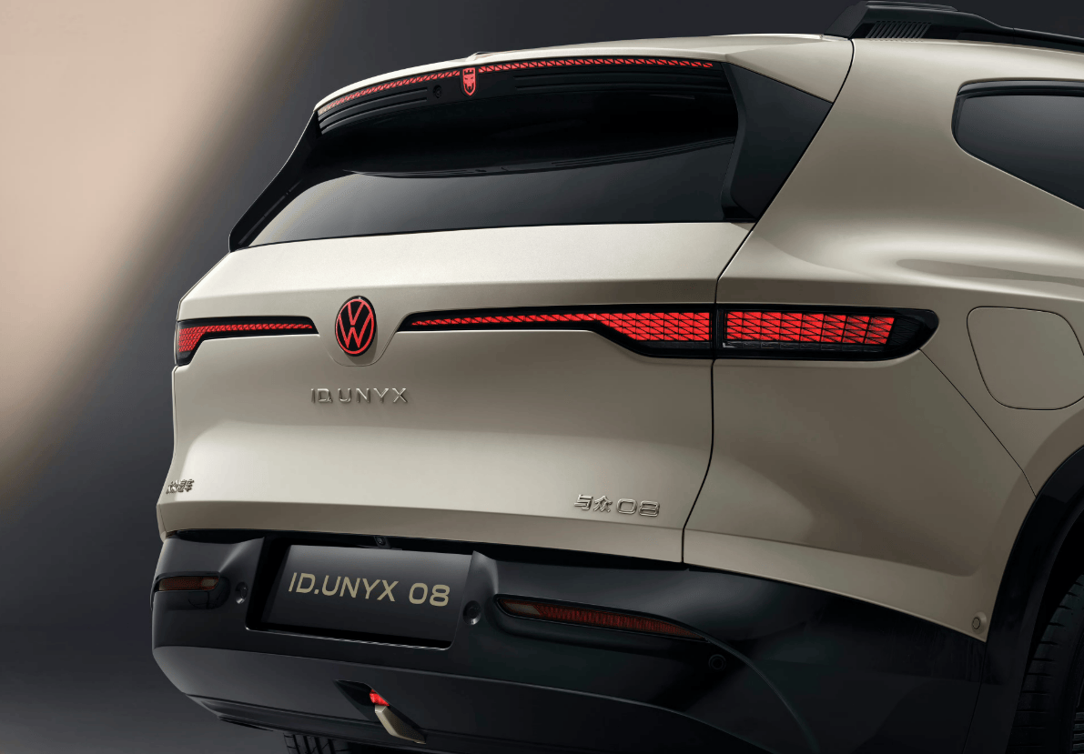 车侧通过短前悬+长后悬的比例设计,拉伸了视觉长度,同时还可以看到无框车门和隐藏式门。尾灯并没有贯通,而是与头灯的设计相呼应,点睛之笔是高位刹车灯,中间融入了狼头标,这里应该是一个彩蛋,因为大众品牌的发源地沃尔夫斯堡的别称就是狼堡。