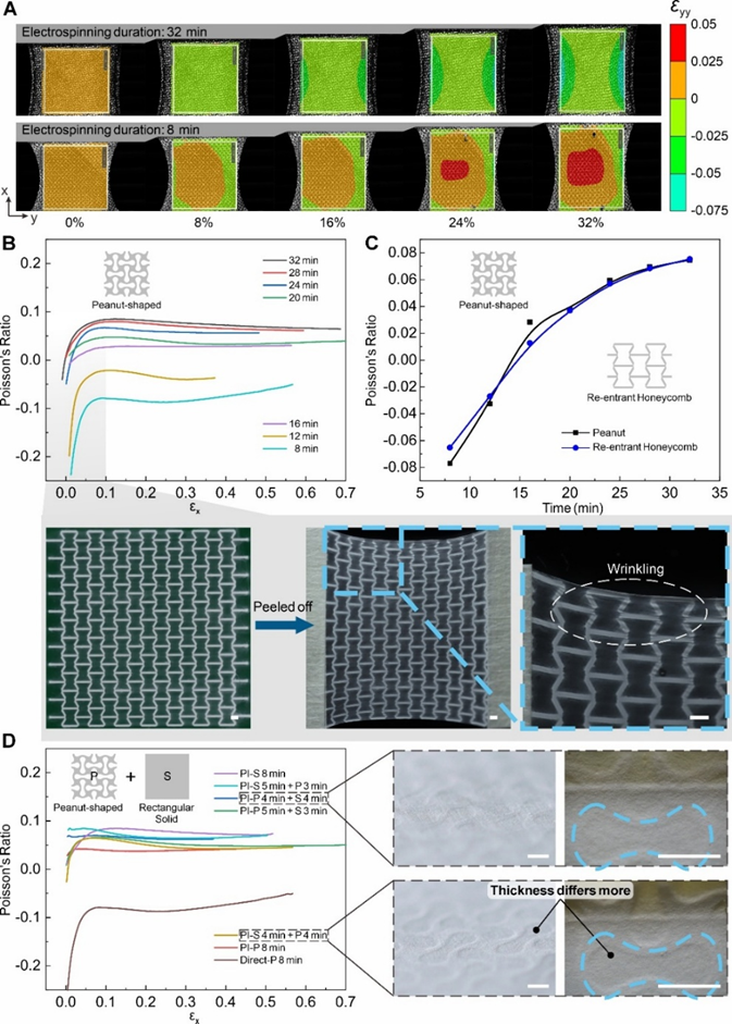 图3. 具有可编程泊松比的图案化纳米纤维机械超材料
