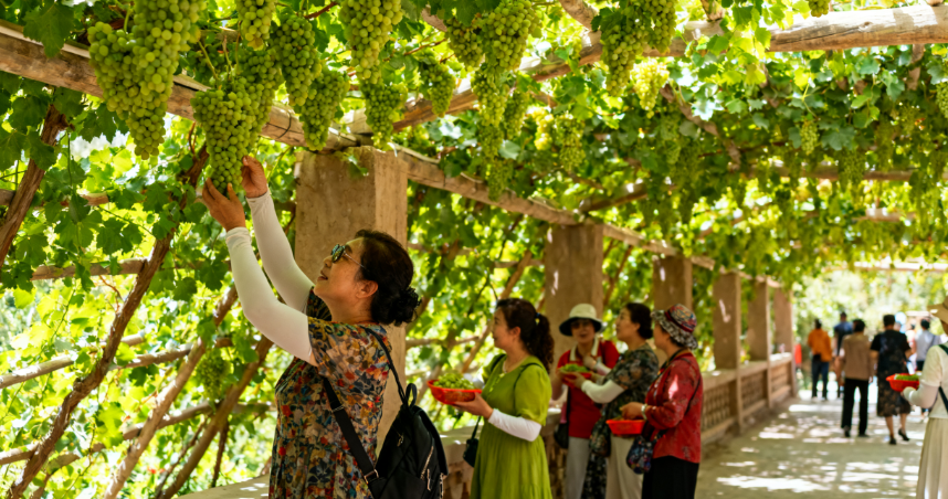 抵达喀什古城后,高高带我们逛老城区,教我们识别正宗的新疆烤包子、缸子肉,还帮我们砍价,10 元 / 份的缸子肉,肉质软烂、汤汁鲜美,武汉小伙伴都喊 “太香了”~ 她带我们去本地集市买新疆水果,葡萄 10 元 / 3 斤、哈密瓜 5 元 / 斤,比武汉超市便宜一半,还教我们 “挑葡萄看果粉,挑哈密瓜看纹路”~