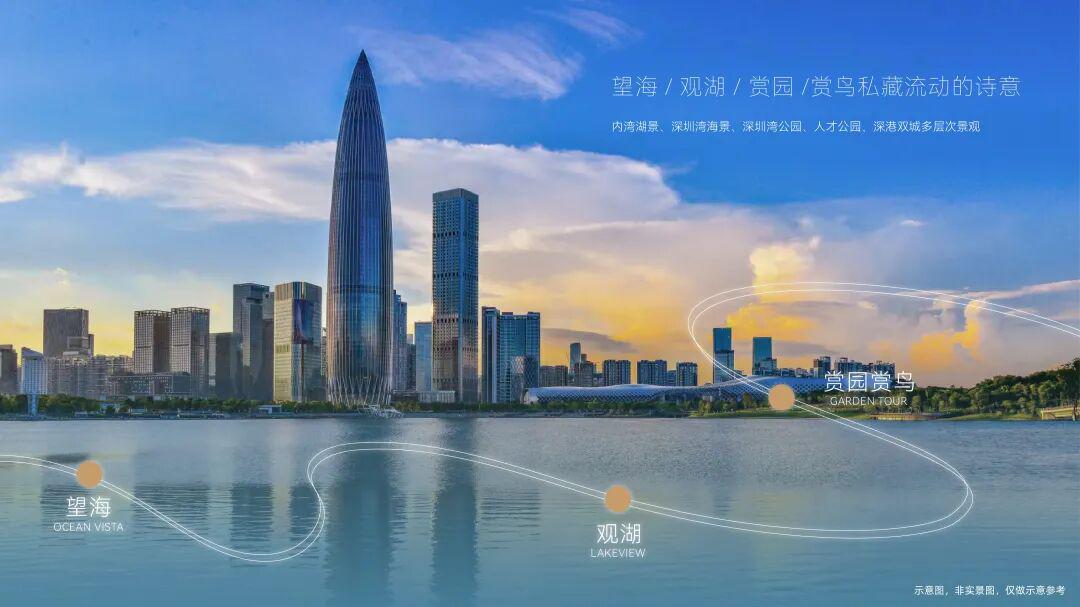 一席藏尽海/湖/园/城,四重盛景,踞守深圳湾畔约270°环瞰海景壮阔、湖境悠然、园景森氧、城脉璀璨的封面地脉。近享深圳人才公园,占地77万平方米,内湖面积约32万平方米,"公园生活圈"步行可达。(信息来源:深圳人才公园公众号)