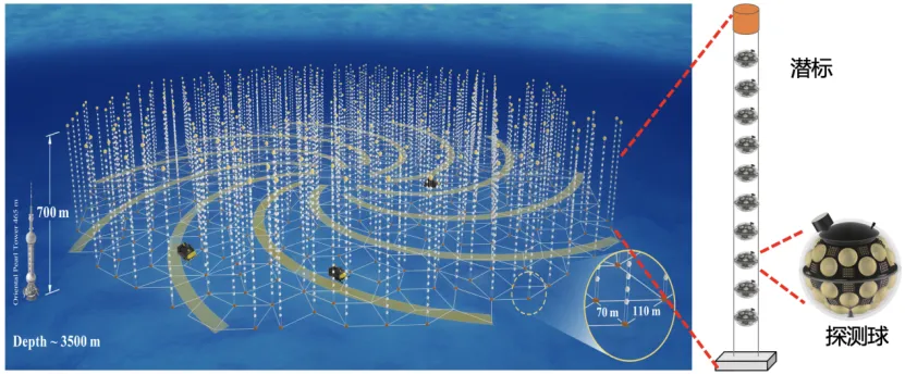 “深海望远镜阵列,犹如一片南海海底的‘风铃’,这也是我们‘海铃计划’名字的由来。”“海铃”团队负责人徐东莲告诉记者,按计划,预计在2030年,中微子望远镜整体布设于3500米深的西沙海域底部,由约1000根中微子探测潜标组成,形成直径约4公里的圆盘状阵列。