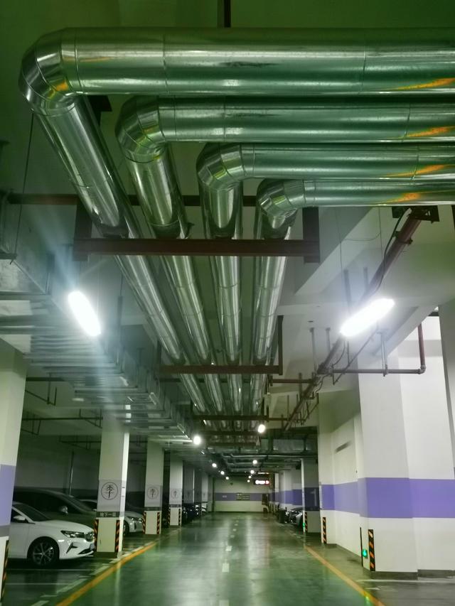 上东国际小区地下停车内上方,管道上加装了支吊架