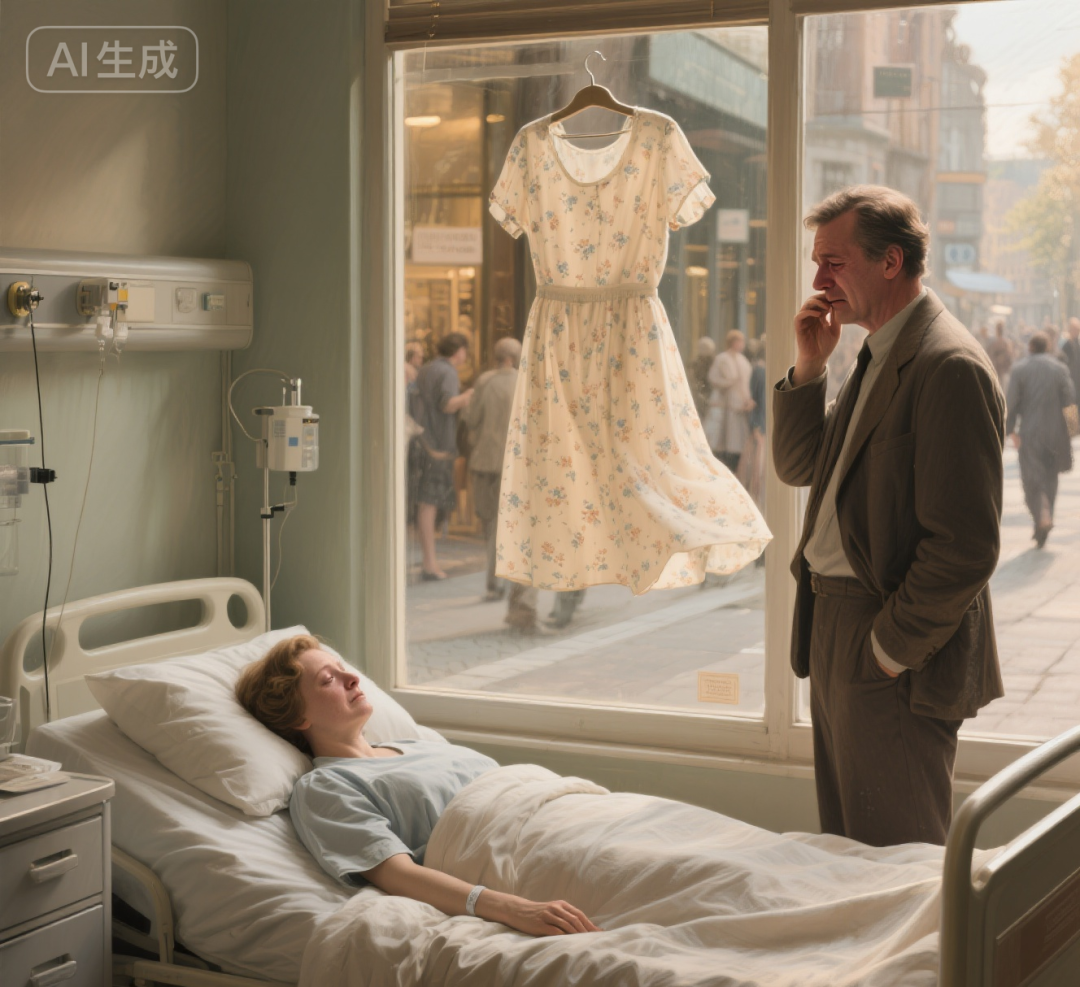 他在橡树城的一家百货商店里,看见了一件挂在橱窗里的连衣裙——柔软的布料,淡雅的碎花,柔软的布料,优雅的剪裁……