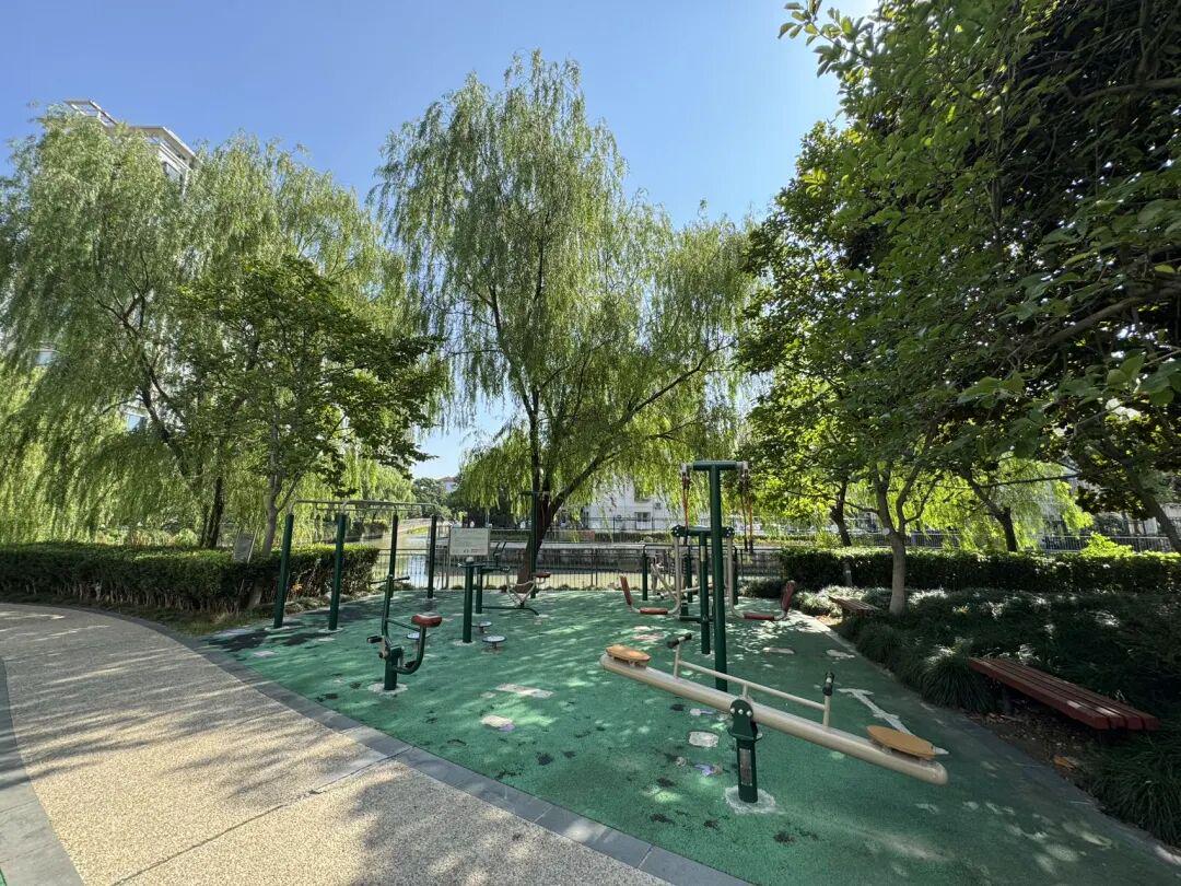 因为小区临河而建,西南侧的楼盘全都是水景房,小区内也配置了沿河步道,活动区就在步道旁,边欣赏河景边健身,确实惬意。