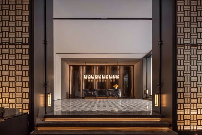 踏入会所门厅,即刻感受到一股奢华雅致的气息。前台采用精选大理石,其独特色彩纹理宛若天然艺术品,展现出非凡的审美品位。头顶,别具匠心的吊灯以其独特的造型和柔和光线,为空间注入温馨与高贵。地面铺陈的拼花地砖,以其精致的几何设计,与深色墙面相映成趣,既显时尚气息,又不失古典韵味,令人赞叹不已。