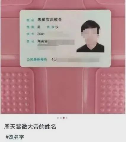 还有湖南一个00后,先叫朱雀玄武,后来改为“朱雀玄武敕令”,现在又因觉得该名字易引发误解且拗口,申请随母姓并更名为“周天紫微大帝”!