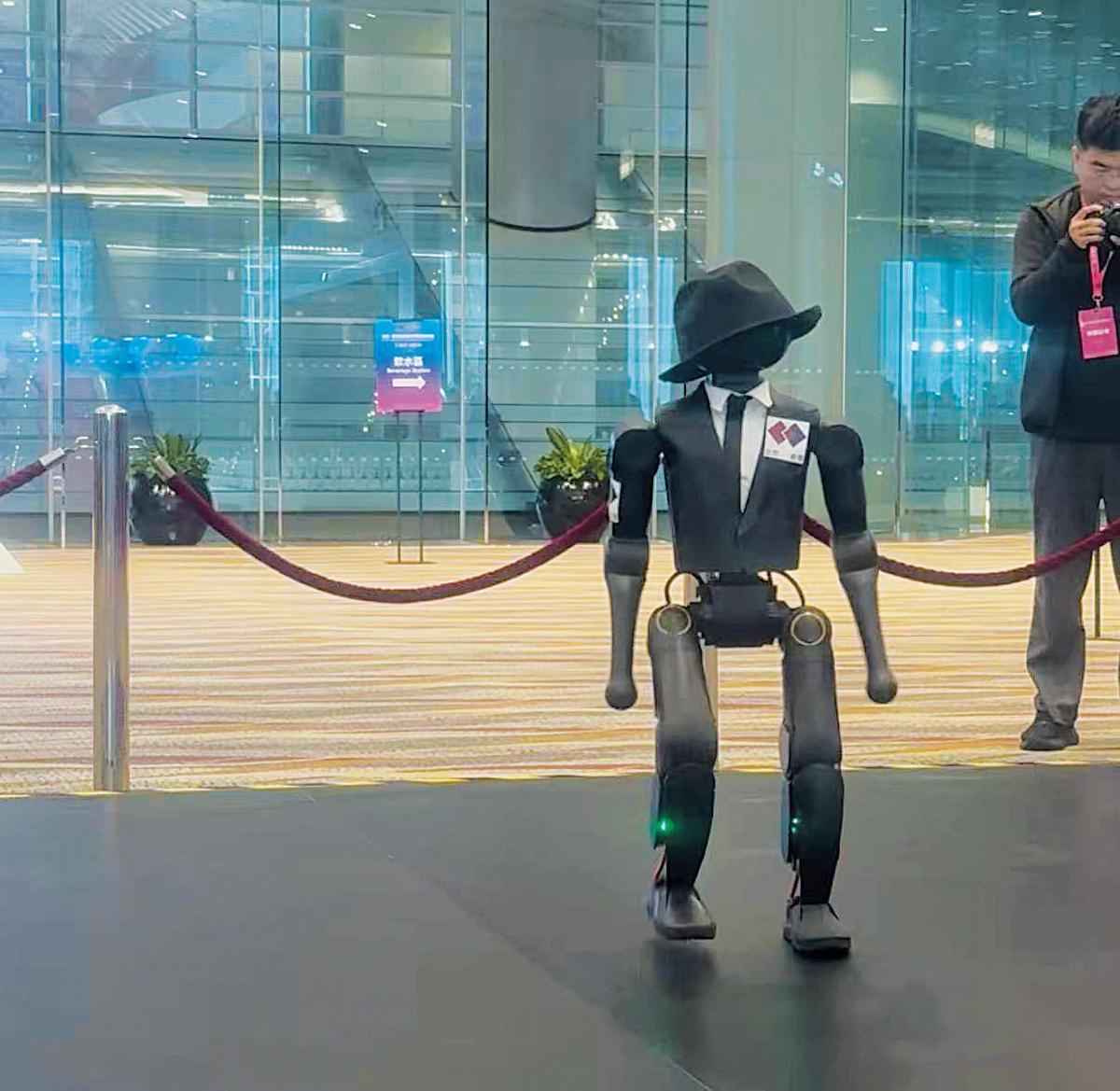现场两家北京企业和一家香港企业带来了三台机器人各显身手。北京加速进化科技有限公司带到现场的是新款Booster K1机器人,身高仅95厘米。它穿着西装,戴着礼帽,模仿迈克尔·杰克逊的经典“太空步”舞蹈动作,收获了一众好评。“这是一款入门级机器人,虽然身材小巧,却具备踢球、拳击、舞蹈等多种技能,成为中小学人工智能与机器人通识教育的理想载体。”该公司国内销售负责人黄倩介绍,该系列机器人不仅适用于学生的算法决策与视觉训练,也支持高中及大学阶段学生进行C++编程与运控系统开发,实现从基础认知到深度研发的多层次教学覆盖。“目前我们企业‘出海’步伐加快,产品外销比例已达40%,希望借助香港的地理与平台优势,进一步拓展国际市场,推动智能教育产品走向更广阔的舞台。”