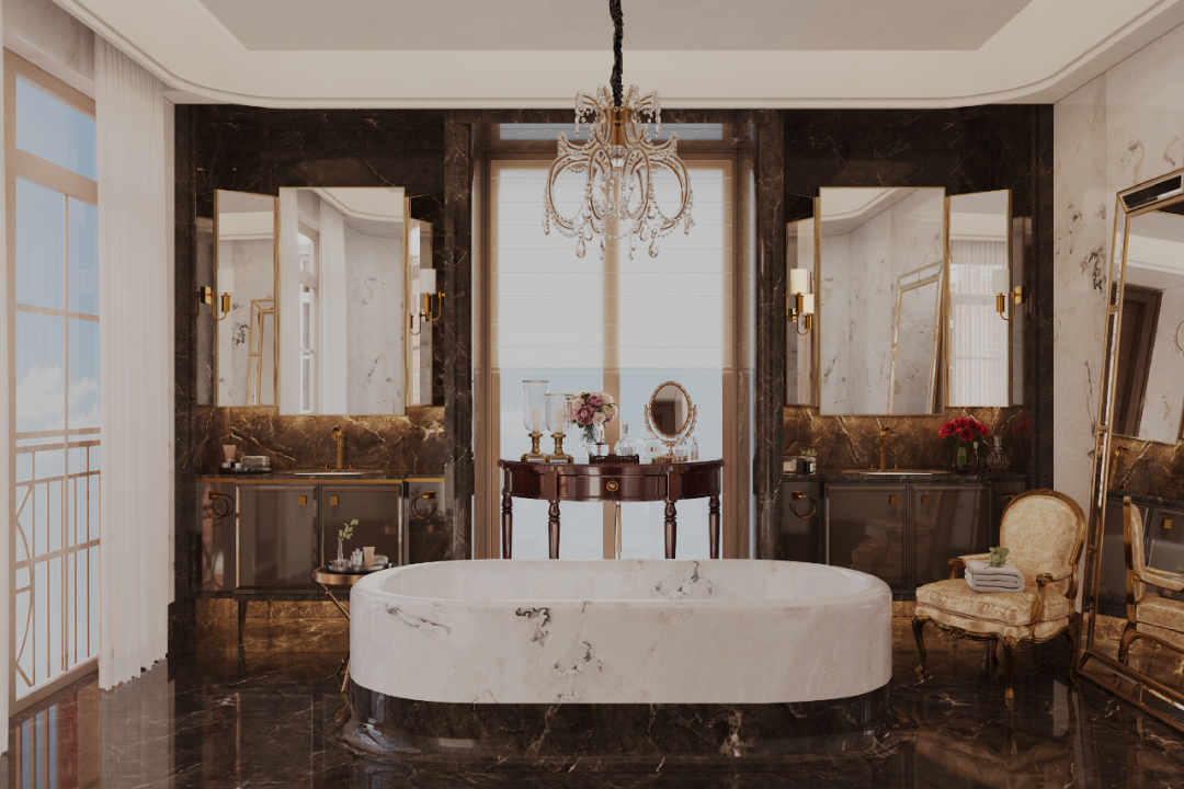 秩序,是主卫浴空间布局的重点。两个独立台盆相对而立,分属男女主人,营造出从容自如的使用体验。大面积运用黑白撞色大理石,让空间的秩序美与材质的自然美融合,颇具观赏韵味。