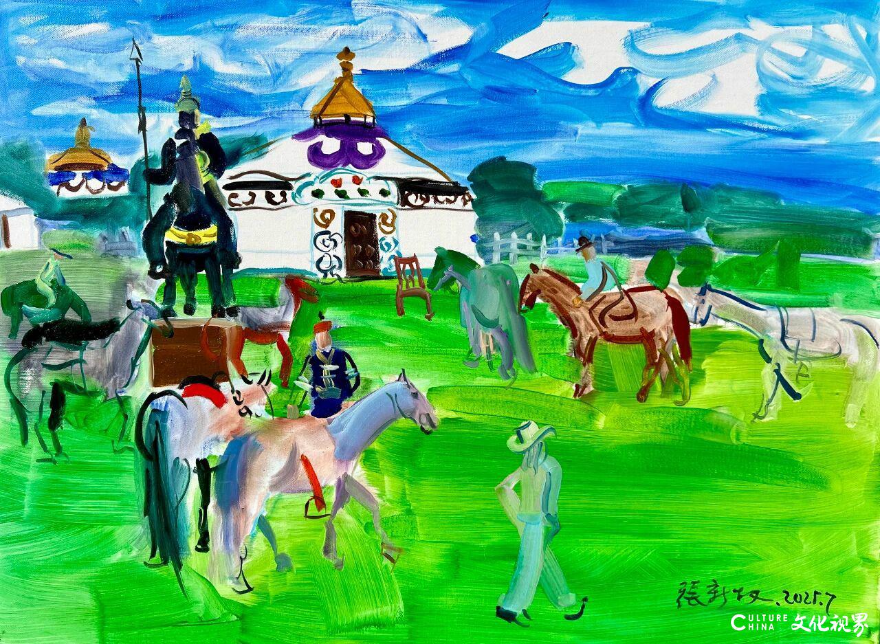 张新权的色彩世界,是一场情感的视觉赋格。他挣脱了写实色彩的束缚,以表现主义的激情赋予色彩强烈的主观情感维度。在《夏日草原》系列里,大面积翠绿色草原如生命的浪潮铺陈开来,与湛蓝天空形成冷暖碰撞,这绿色并非对自然的复刻,而是草原蓬勃律动的视觉化表达,草叶的簌簌低语仿佛都凝结在色彩的层叠中。那些明丽的粉、深沉的棕点缀在马匹与人物身上,高饱和度的色彩碰撞制造视觉冲击的同时,也暗合了草原生命的热烈奔放。而在《印象青岛》中,他以通透的天蓝铺陈海面,用暖橙与米黄勾勒红瓦绿树的城市轮廓,冷色的海与暖色的建筑交织,既捕捉了青岛海滨的清新温润,又以主观色彩重构了城市的烟火气与历史感。每一抹颜料堆叠都是情感宣泄,观者能在视觉震颤中触摸画面背后的精神温度。