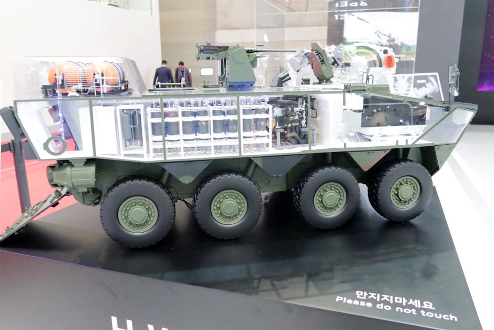 在首尔举办的2025年韩国国际航空航天及防务展(ADEX-2025)上,现代Rotem公司展示了新型H2 WAVe装甲车,该车的主要特点是安装了氢燃料电池,以及在车顶后部设置的两个明显的储氢罐。此外,该公司还展示了采用相同技术的多功能电动无人地面车辆。