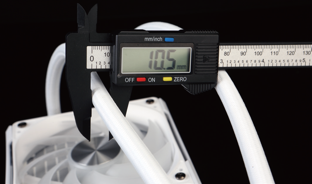 银欣E360 MAX的冷排采用了高密度低水阻W型散热鳍片,冷排厚度达到了27mm,增加散热器储水量的同时,还扩大了散热面积,从而让散热器效率更高。它采用的低水阻设计,可以更迅速地将热量传导到鳍片上,并通过空气流动进行散热。冷头连接冷排的水管采用了常见的橡胶材质,外部直径在10.5mm左右,表面用编织网进行包覆,长度为430mm,比很多低端360mm水冷散热器的水管长了近50mm,能满足各类主流的ATX甚至是E-ATX机箱的安装长度。另外,配件中还附带了两个水管理线夹,能够让水管走线更加规整。