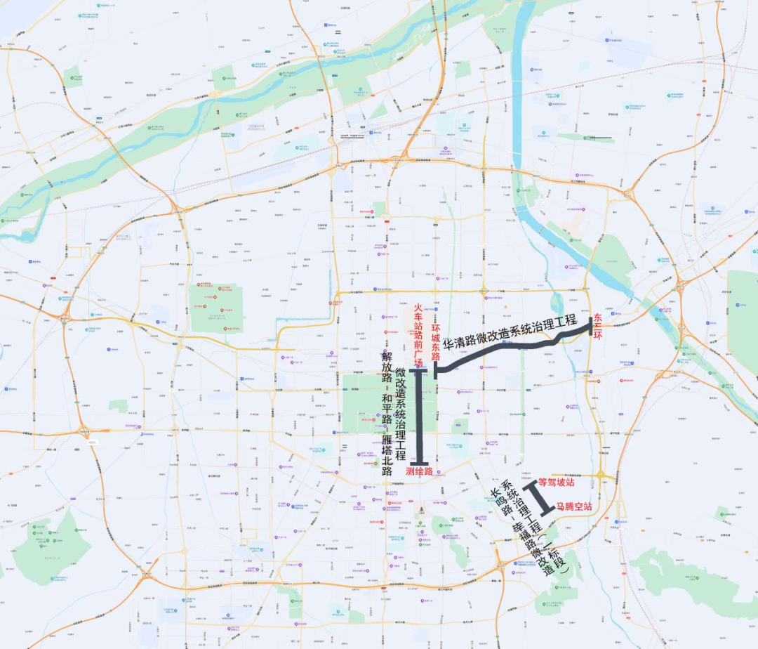 2、解放路-和平路-雁塔北路微改造系统治理工程,南起测绘路,北至火车站站前广场,全长约4.3km(不含友谊路、东大街、东西五路交叉口)。涉及新城、碑林两个区域;主要内容包括:道路工程、交通工程、照明工程、管线工程、绿化工程。