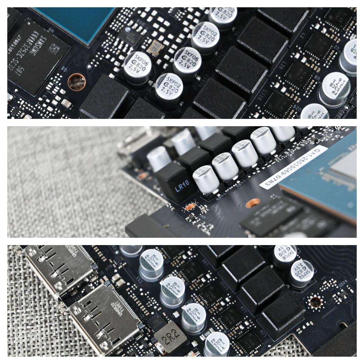元件部分,RTX5080金属大师OC所有供电均采用固态电容和Alpha & Omega Semiconductor的AOZ5310NQI DrMos(SPS),核心供电R10电感,显存部分采用R22电感;另外,DrMos的AOZ5310NQI规格为60A。