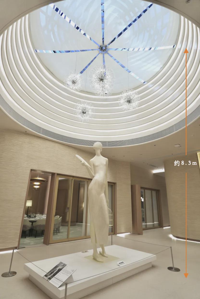 中庭摆放着持扇少女姿态的雕塑是当代艺术家陈逸飞先生的雕塑真迹《东方少女》,此前伴随“时代逸飞:陈逸飞回顾展”珍藏于浦东美术馆,本次也来到会所进行为期半年的特别展出