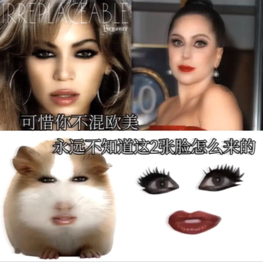 当然,猪妞并非自诞生起就是幼态的。猪妞表情包最初源自外网的一组抽象梗图,是将荷兰猪的形象与碧昂丝的五官进行拼接组合。烈焰红唇、浓密睫毛等女性符号与荷兰猪的憨厚形成强大反差,有点像浓妆艳抹版胖猫。为了做出审美区隔,性感猪妞逐渐被改造成后来的可爱猪妞,呈现方式也从表情包变成了AI视频。