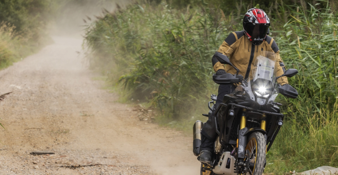 前全可调43mm KYB倒置前叉,行程200mm,KYB后减震,行程190mm。前轮21寸,后轮18寸,原厂倍耐力STR蝎子胎,离地间隙220mm。
