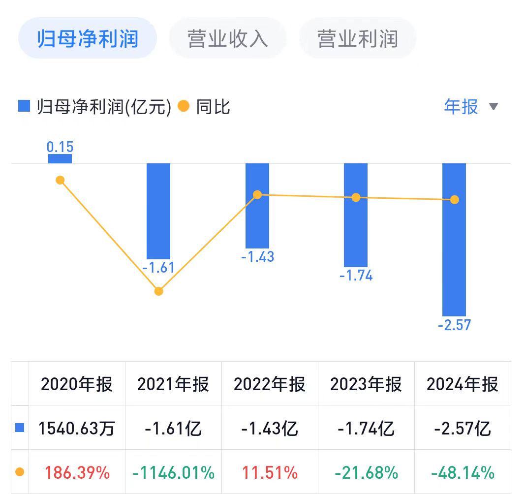 2021年—2024年,美芝股份营业收入连年下降,净利润也是持续亏损,数据显示,公司归母净利润分别为-1.61亿元、-1.43亿元、-1.74亿元、-2.57亿元。