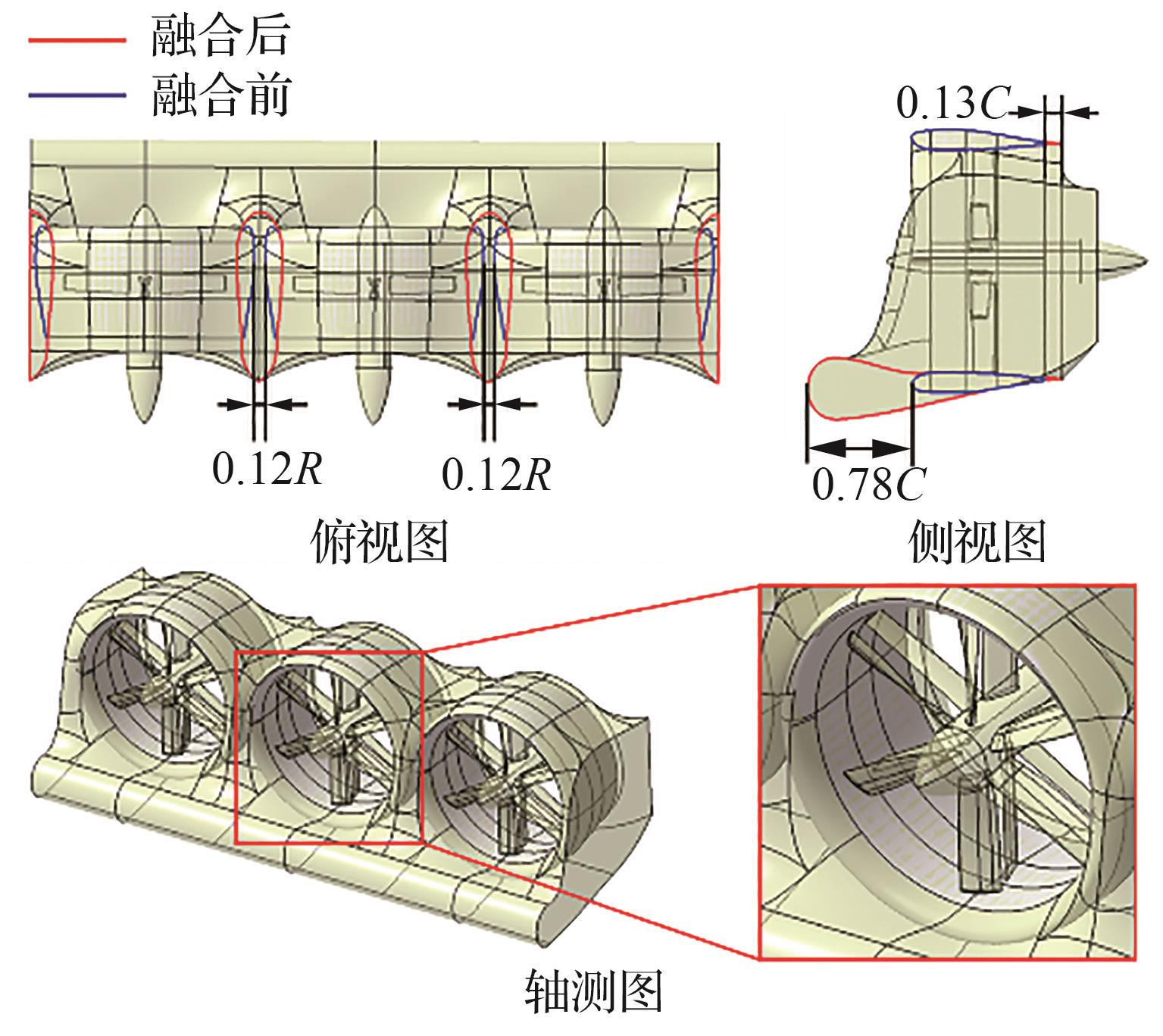 对于分布式涵道风扇布局,多个涵道风扇之间以及涵道风扇与机翼/襟翼之间的复杂气动干扰是设计的难点。研究显示,横向紧凑布置的分布式涵道风扇会导致相邻涵道之间的入涵气流迎角减小,降低推进力效,内侧涵道受影响最为明显;而涵道风扇组融合会引起入涵气流畸变,涵道顶部扩张段产生流动分离,导致力效降低。这些气动干扰效应的准确预测和控制,是分布式涵道风扇设计的关键挑战。