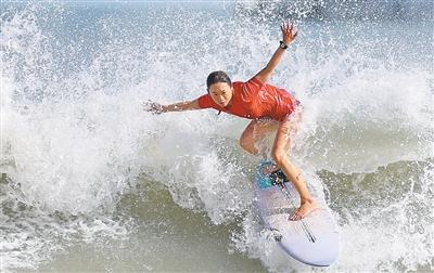 海南队选手在冲浪项目女子短板比赛中。新华社记者 卢汉欣摄