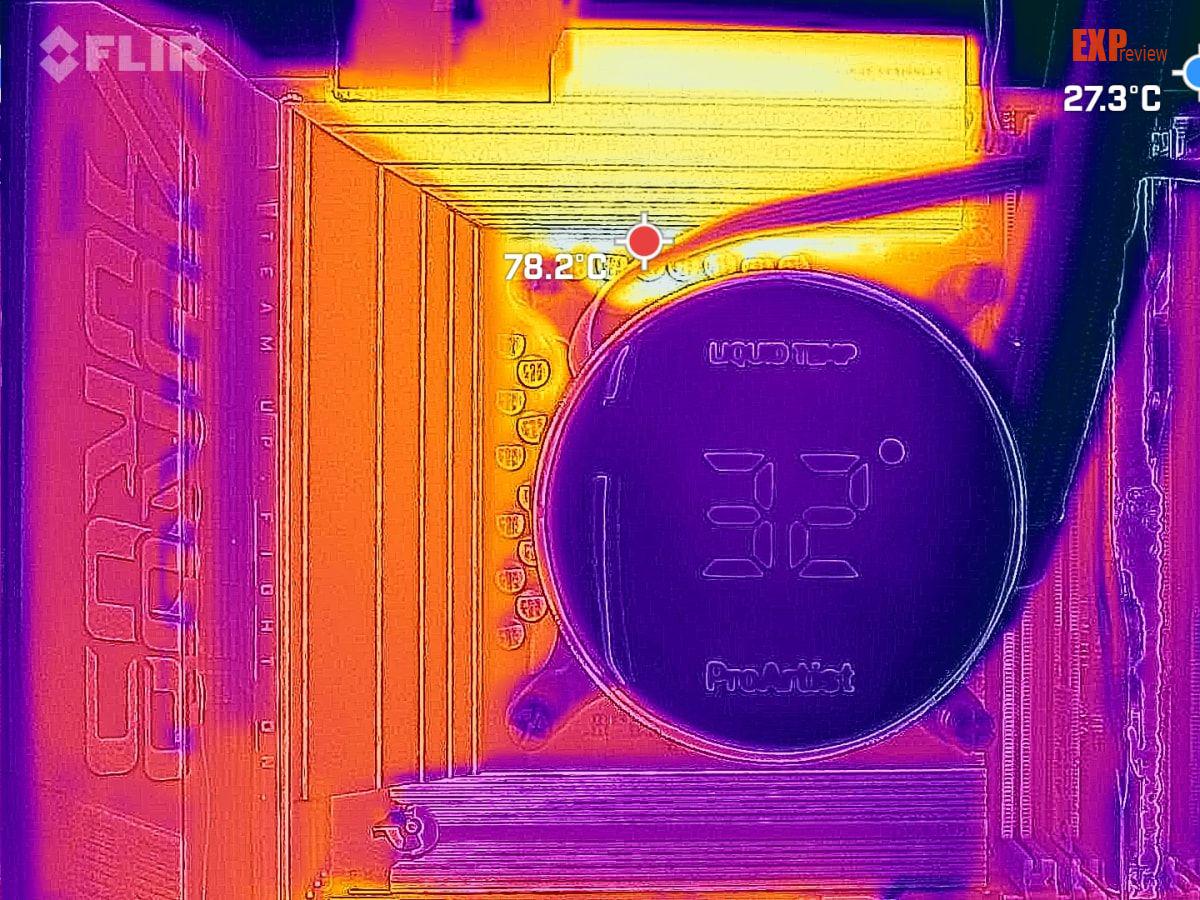 在进行Performance挡位烤机的同时,我们使用红外摄像头监测到主板的CPU供电模组主要集中在顶部的散热模块上,表面最高温度点为78.2℃,而左侧的散热装甲得益于更大的体积,温度要低不少。从拆解时的情况来看,它俩并不是相连的,热量无法相互分担。此时室温大约为23.5℃。