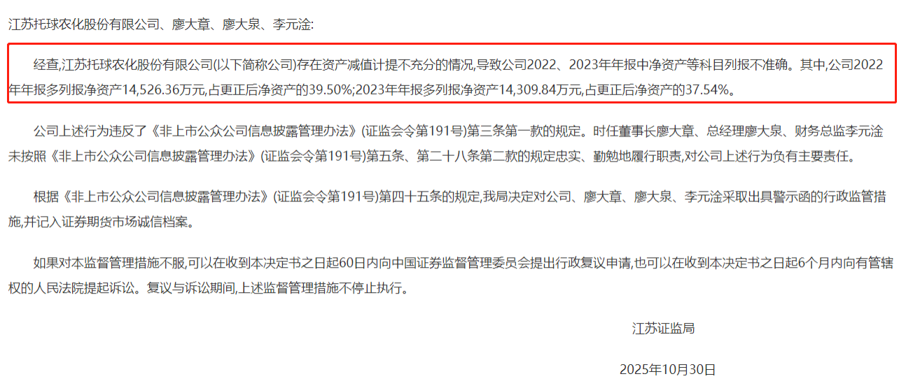 值得注意的是,在10月30日,江苏证监局发布关于对托球股份、廖大章、廖大泉、李元淦采取出具警示函措施的决定。