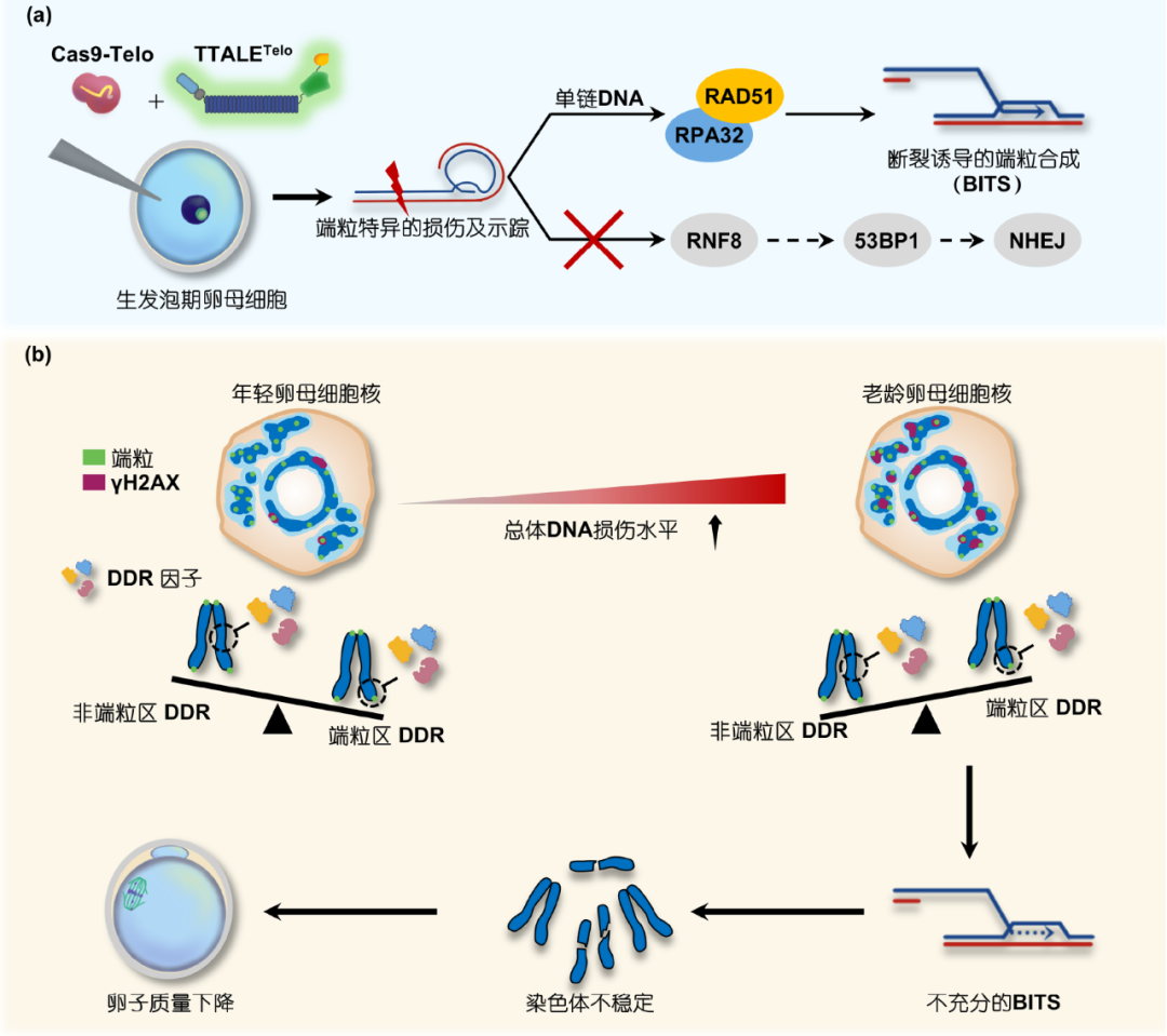 图 1 生殖衰老过程中端粒DDR不充分导致卵母细胞染色体不稳定的机制. (a) 哺乳动物卵母细胞的端粒DNA损伤应答机制(DDR); (b) 生殖衰老中不充分的BITS导致卵母细胞染色体不稳定