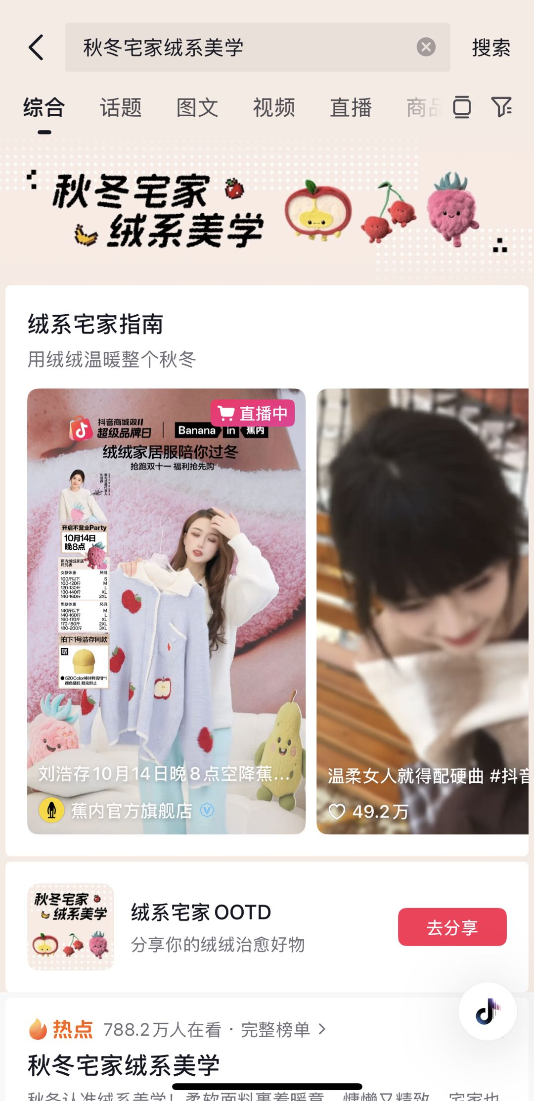 在同一阶段的风格探索中,面对秋冬保暖赛道的激烈竞争,蕉内以“秋冬宅家绒系美学”为核心主题加入「抖音风格实验室」。IP基于对用户“秋冬既要保暖,又要兼顾舒适与美感”需求的洞察,与蕉内的“体感科学”品牌定位深度契合,打造“科技感+舒适美学”的家居穿着体验,通过场景化内容构建与全链路转化设计,让品牌产品亮点精准触达需求人群,实现从趋势参与到风格引领的跨越。