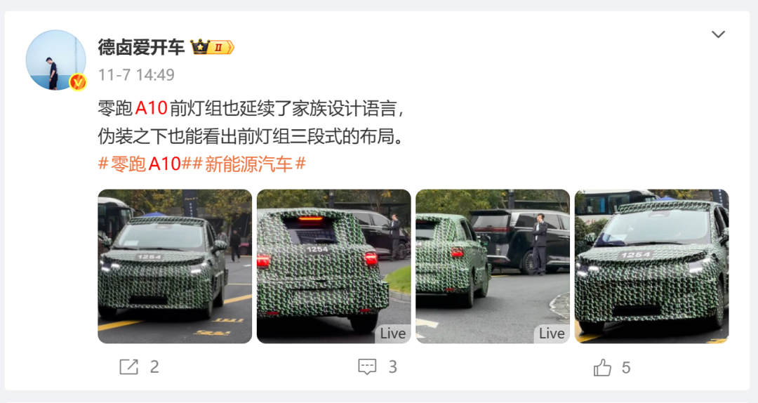 本月 7 日,@德卤爱开车就分享了零跑 A10 的伪装车谍照,不过测试车被厚重伪装包裹,许多细节尚不透明。