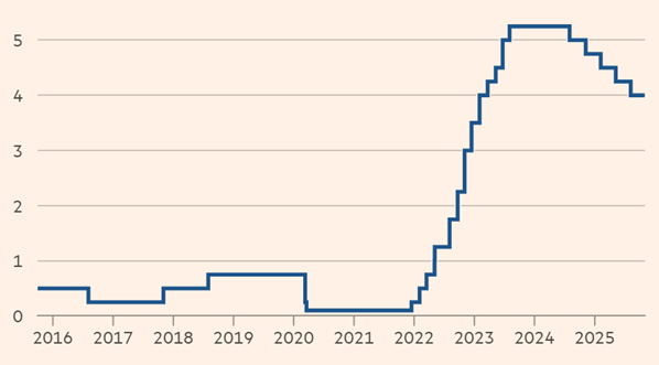 货币市场交易员普遍预测,在明天召开的货币政策委员会(MPC)会议上,基准利率将维持在4%的当前水平,市场对周四降息25个基点的预期概率不足三分之一。