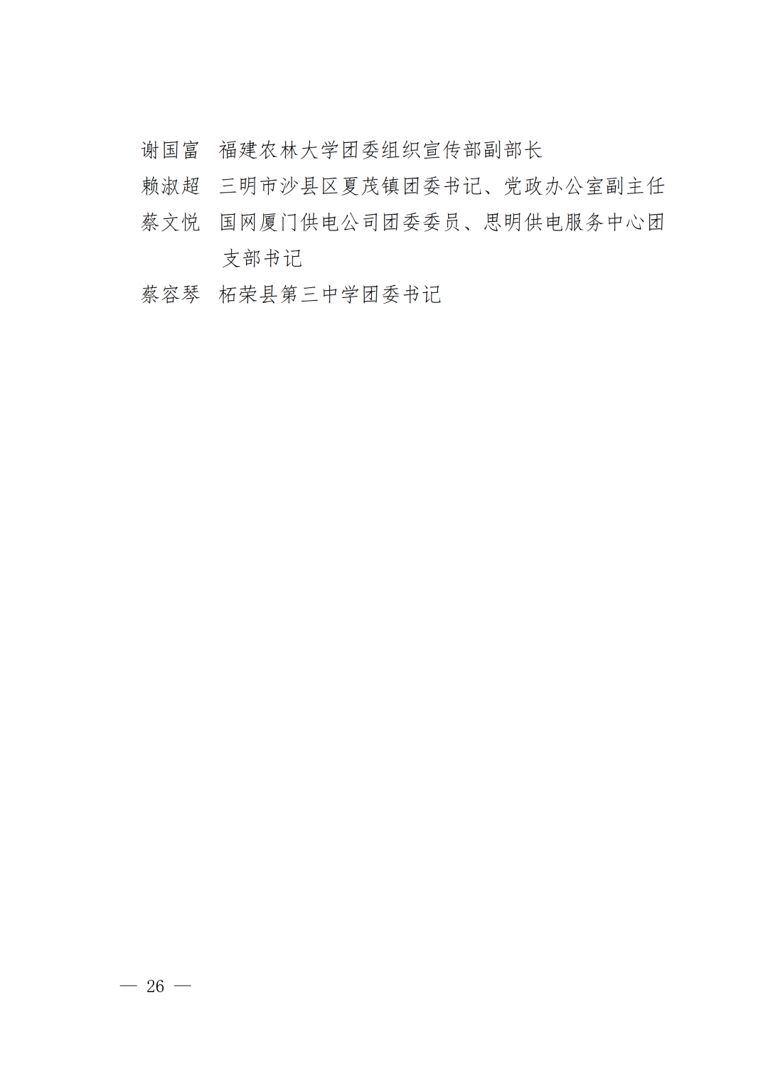 为表彰福建省优秀团员青年在推进中国式现代化福建实践中的贡献,集中展示新时代团员青年的精神品格和价值追求,激励引导全省广大团员青年积极投身强国建设、民族复兴伟业,经研究同意,团省委、省青联授予张子明等100名同志2025年度福建青年五四奖章(其中,杜晓航等10名同志为2025年度福建青年五四奖章标兵),授予海洋三所厦门海洋生态保护与修复创新团队等50个集体2025年度福建青年五四奖章集体〔其中,国家电网福建电力(福州带电作业)“双满意”青年突击队等10个集体为2025年度福建青年五四奖章集体标兵〕,授予丁锦珍等50名同志2025年度福建新时代青年先锋;团省委授予中建海峡总承包公司团委等25个基层团组织2025年度福建省五四红旗团委,授予福州市长乐区人民检察院团支部等25个基层团组织2025年度福建省五四红旗团(总)支部,授予王雪等50名同志2025年度福建省优秀共青团员,授予王晓荣等50名同志2025年度福建省优秀共青团干部。