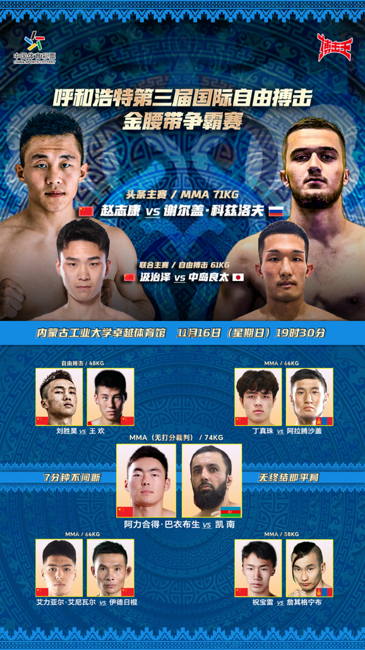 北京时间11月16日晚,“河套王”呼和浩特第三届国际自由搏击金腰带争霸赛中即将震撼开打,当晚备受瞩目的头条主赛中,赵志康即将对阵俄罗斯高手,联合主赛阵容也同样星光熠熠,一场激动人心的中日对决——由中国新生代翘楚汲治泽迎战日本选手中岛良太。