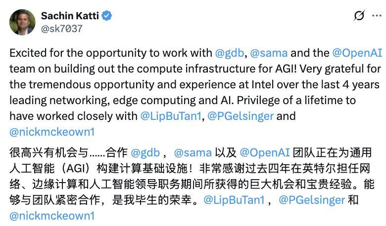 8. OpenAI总裁Greg Brockman在社交媒体公开确认,Katti将全面负责公司计算基础设施的设计与部署,为实现通用人工智能(AGI)的研究目标提供底层支撑。这并非一个象征性职位,而是实权核心岗位。