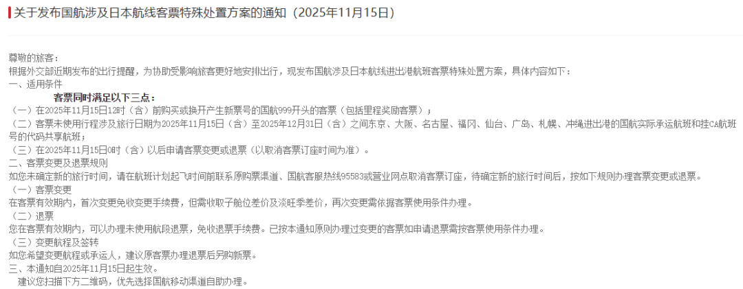 中国国际航空在通知中明确,对于在今年11月15日12时(含)前购买或换开产生新票号的国航999开头的客票(包括里程奖励客票);客票未使用行程涉及旅行日期为2025年11月15日(含)至2025年12月31日(含)之间东京、大阪、名古屋、福冈、仙台、广岛、札幌、冲绳进出港的国航实际承运航班和挂CA航班号的代码共享航班;在2025年11月15日0时(含)以后申请客票变更或退票(以取消客票订座时间为准)。在客票有效期内,首次变更免收变更手续费,但需收取子舱位差价及淡旺季差价,再次变更需依据客票使用条件办理。在客票有效期内,可以办理未使用航段退票,免收退票手续费。