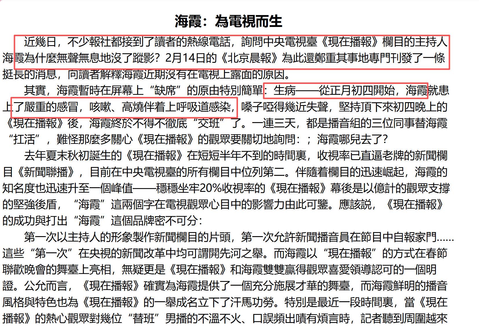 没想到只是短短的三天没见,网友们都纷纷关心起了海霞的身体状况,为此《北京晨报》还专门发表了一篇文章名为《海霞不能生病》。