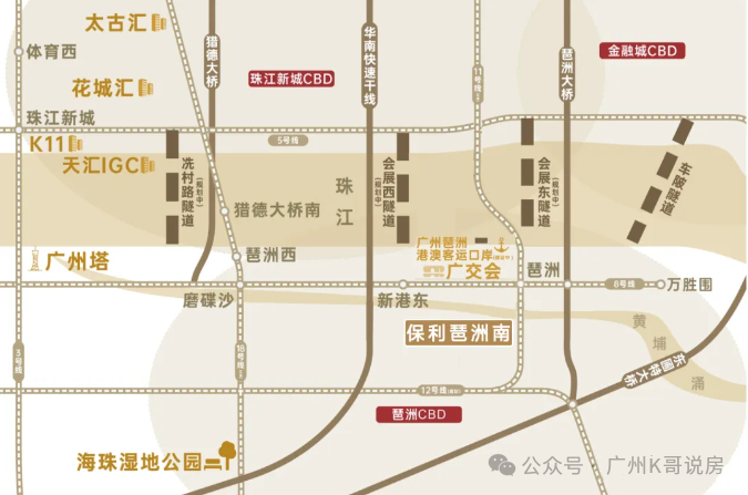 交通配套保利琶洲南项目的最大优势,无疑是地段,其位于琶洲南TOD东侧,现状是大围公园,北边是黄埔涌对望广交会展馆,南边是新滘路,西边是赤沙旧改,东边是科韵路。