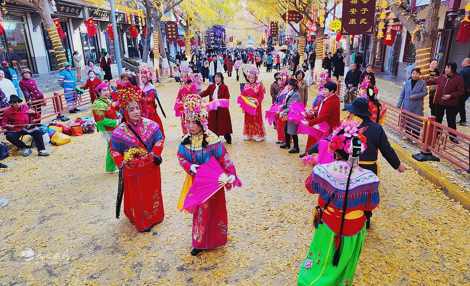 我驻足观看,只见街南,扮演伏羲、女娲兄妹的男女演员,在跳《一画开天》和《女娲补天》舞,纷纷扬扬的落叶,天然地构成了史前先祖“身披兽皮树叶”的意象。街北,十几位古装加身的女子以落叶为席,把古琴演奏得风生水起。