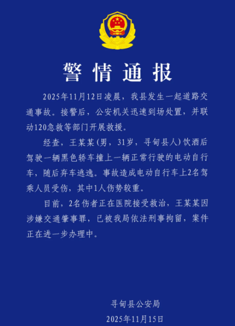 小英丈夫上拉如被逮捕,酒后驾车撞伤2人后逃逸,一人伤势严重,11月15日晚,云南寻甸县警方的一则通报,把一场网络八卦瞬间升级成了严肃的社会事件,通报显示:11月12日凌晨,一名男子酒后驾驶黑色轿车撞上正常行驶的电动自行车,造成两名骑乘人员受伤,其中一人伤势较重,更恶劣的是,这名男子肇事后竟弃车逃逸,目前,他已因涉嫌交通肇事罪被刑拘。