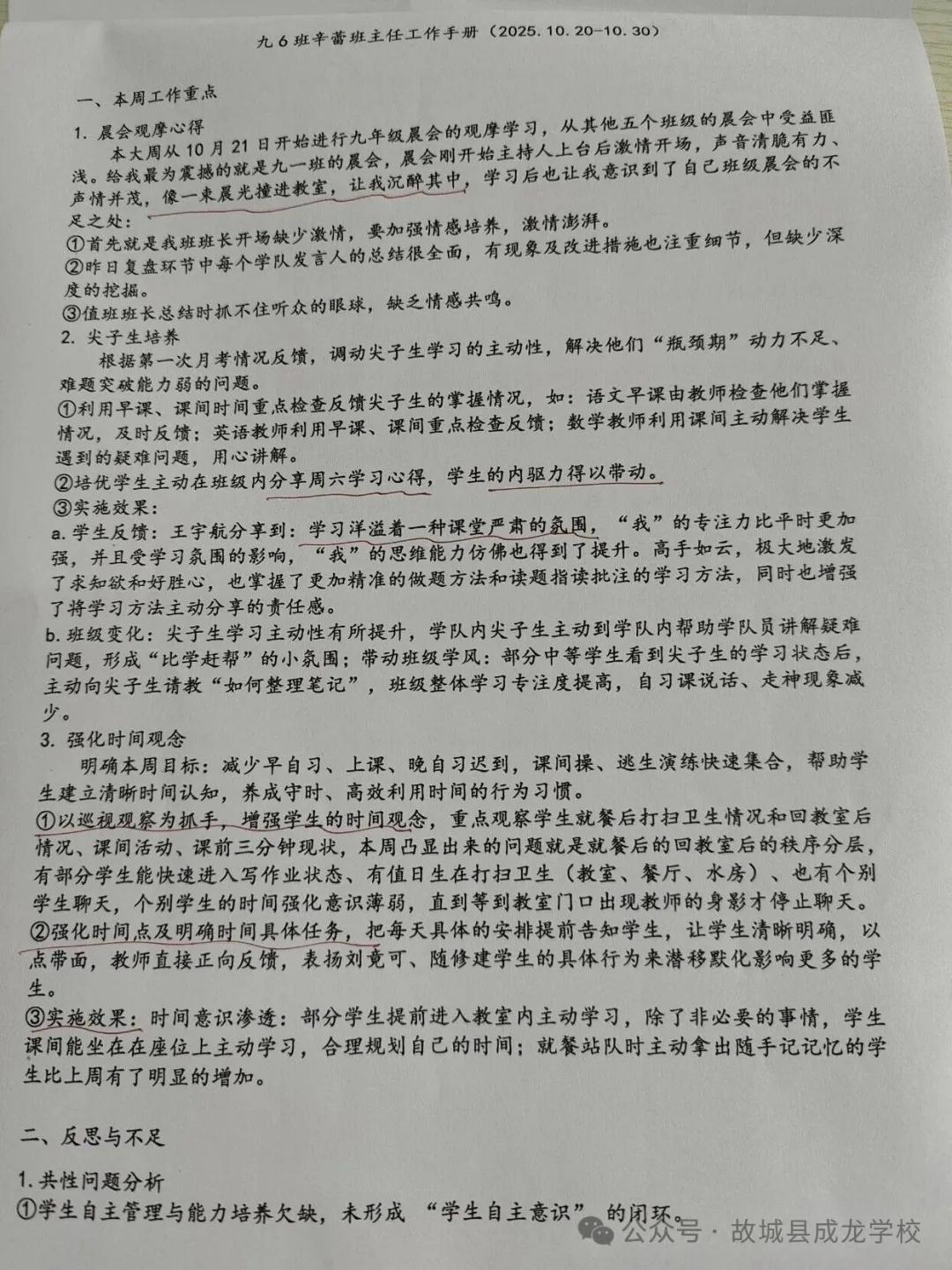 一页页手册,是成龙班主任们日常工作的缩影,更是他们教育情怀与专业智慧的生动体现。从晨会的激情呐喊到课间的轻声提醒,从全班的规范管理到个体的悉心关怀,他们用笔尖记录,用行动耕耘。