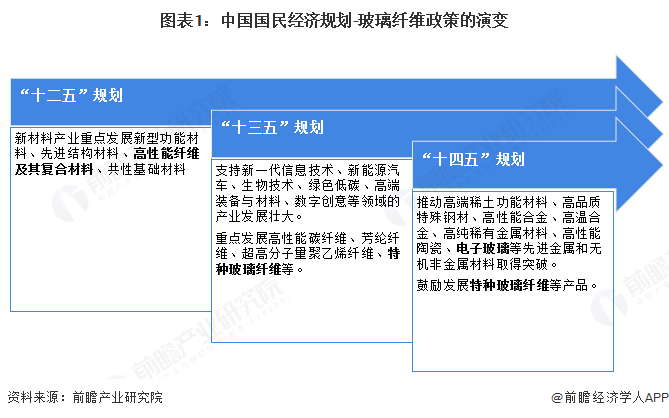 玻璃纤维作为一种在建筑、能源、交通等领域应用越来越广的新型材料,政策方面得到了有力的支持。“十二五”时期鼓励发展高性能纤维和复合材料;“十三五”期间,支持新材料产业发展壮大,重点发展特种玻璃纤维等产品;“十四五”规划中明确提出推动电子玻璃产品取得突破,鼓励发展特种玻璃纤维等产品。