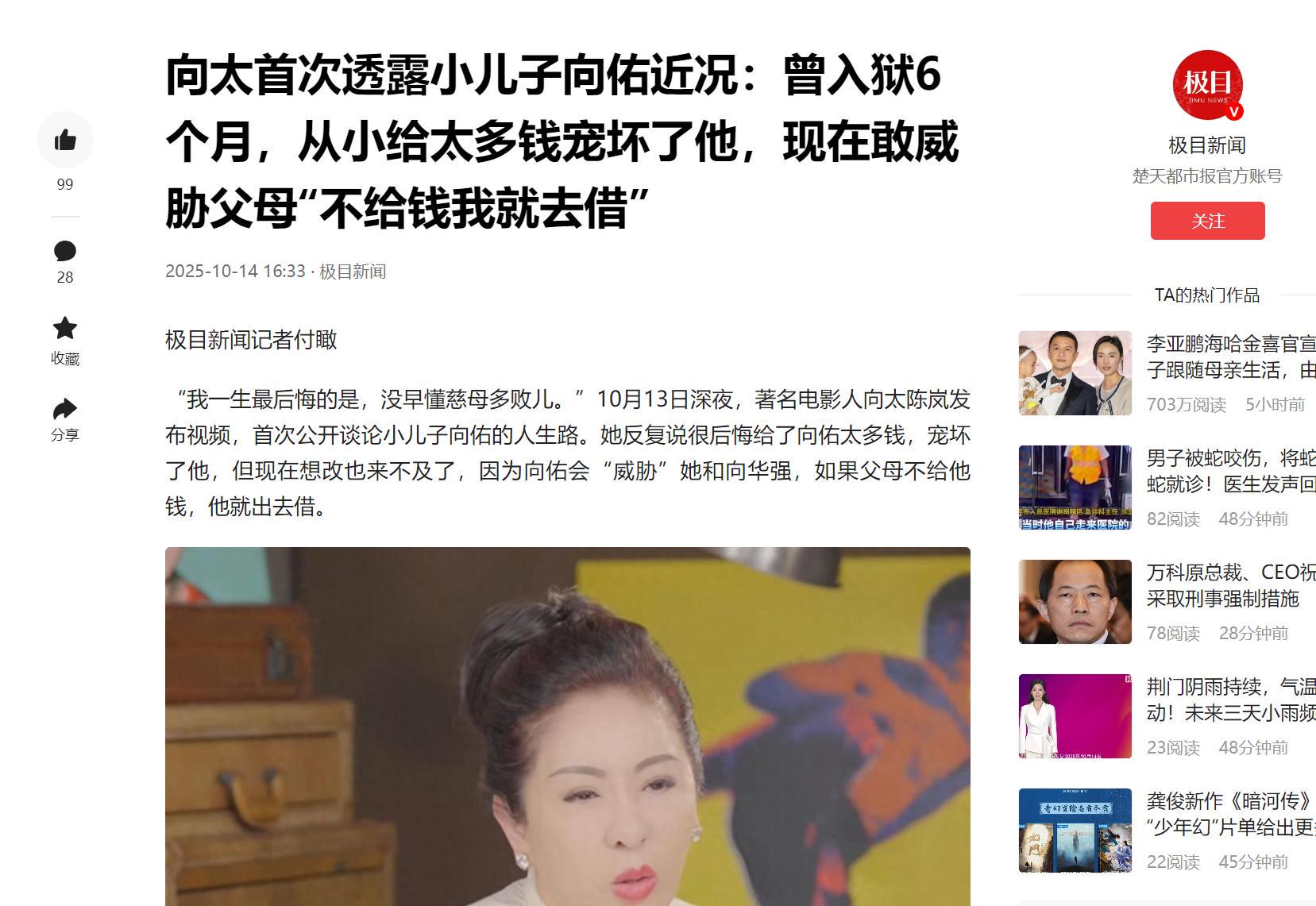 以至于一向强势的向太都忍不住在镜头前流露出些许的脆弱,更直言,这辈子最后悔的事情,就是过度放纵向佑,不早点懂得慈母多败儿的这句话。