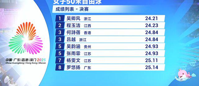 11月17日,第十五届全国运动会女子50米自由泳决赛。浙江选手吴卿风以24秒21的成绩夺得金牌。江西选手程玉洁24秒23获得银牌。以24秒84相同成绩排第三的有两人,包括浙江选手吕越以及刚刚在50米蛙泳项目中拿到铜牌的香港选手何诗蓓。名将张雨霏游出了24秒93,并列第五。
