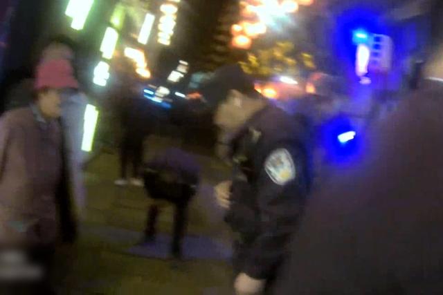 对蹲在青石板路上的民警