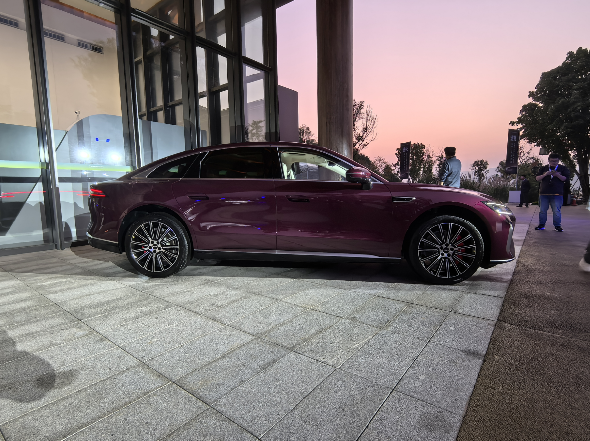 侧面采用了溜背式设计,由于车身体量较大,因此整个线条都十分舒展,具有一定的优雅感。新车配备双冗余半隐藏式门把手,低风阻还安全。尺寸上,新车长宽高分别为5018/1965/1500mm,轴距为3000mm。