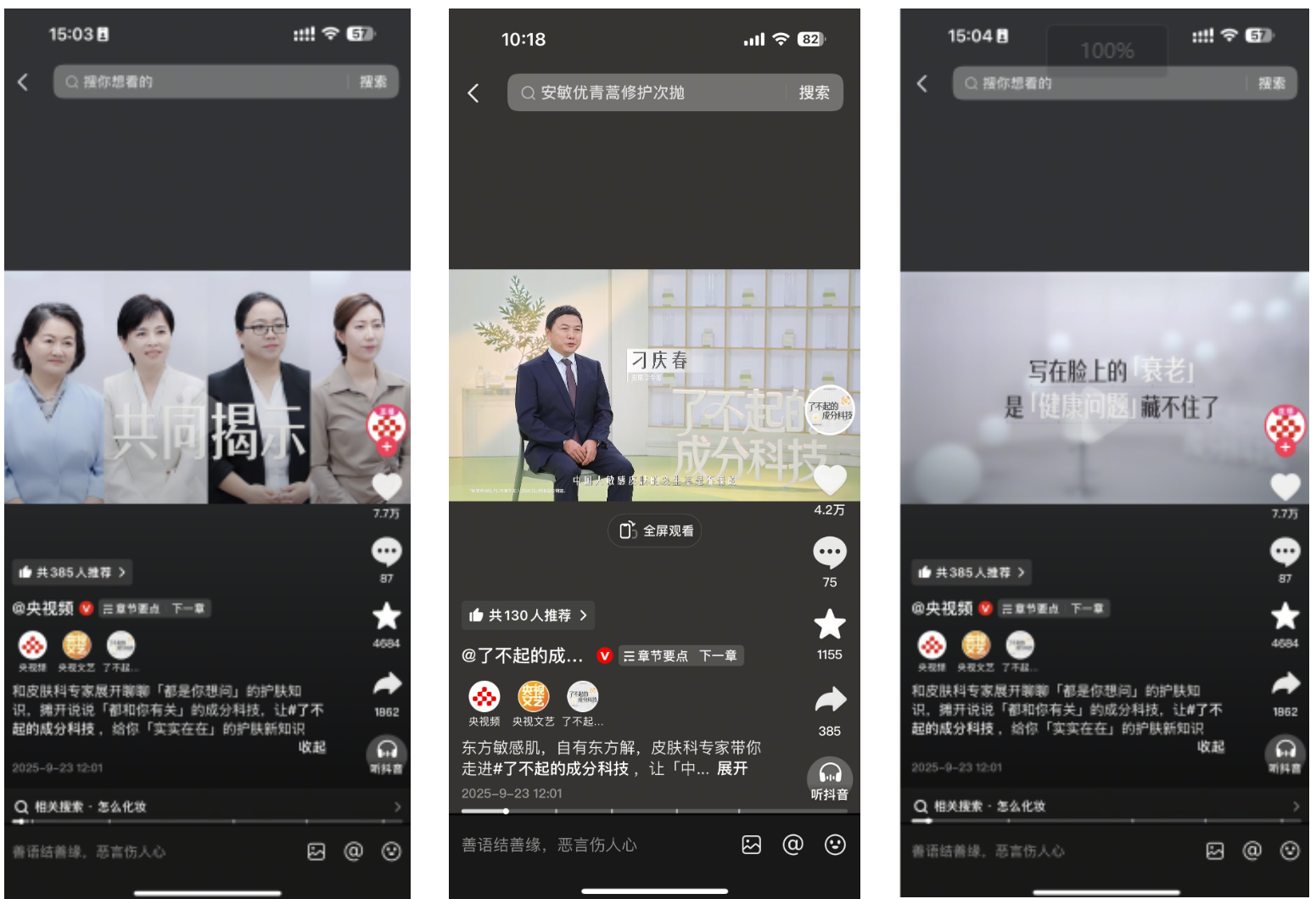 光看懂还不够,得让人信,项目直接拉满顶格信任!先是联动皮肤科专家推出先导片,不搞空泛解读,而是就大众所关心的【都是你想问】护肤知识,展开深度解读,看个短视频轻松学到不少护肤知识,最重要的是皮肤科专家免费给上课。同时还拉上了央视文艺、央视频权威背书,直接把成分科技的可信度抬到国民级高度。