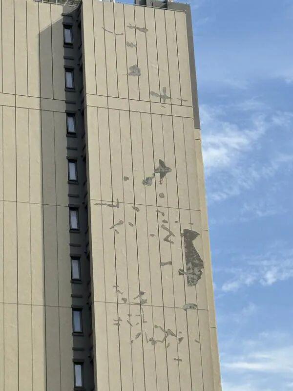 没想到今年4月起,小鼓包开始“爆雷”:漆面先开裂,随后墙皮碎块不断脱落。直至7月,5号楼外墙已脱落近五分之二,连廊道玻璃顶棚上都溅有不少坠落碎块。