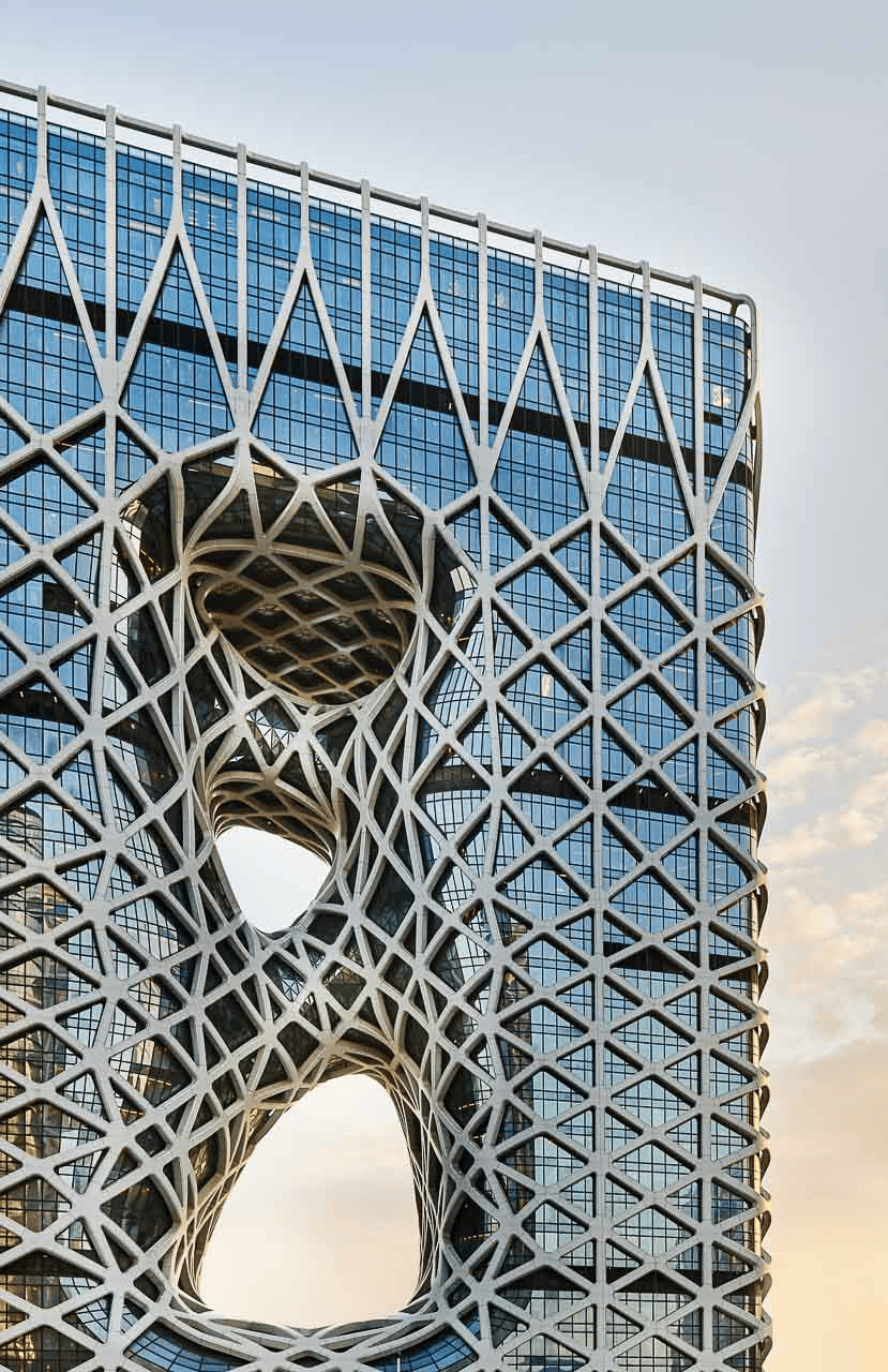 为什么要弄这么多钢结构网架,可不仅仅是为了好看!网架可以传递重力、风力的承重功能,而且还让整个酒店很有未来感!建筑中还被抠出了三个不规则孔洞!整体呈现数字 “8” 的形态,这些孔洞相当于就是创造了很好的观景点,可以直接通过这些孔洞欣赏澳门的城市景观。