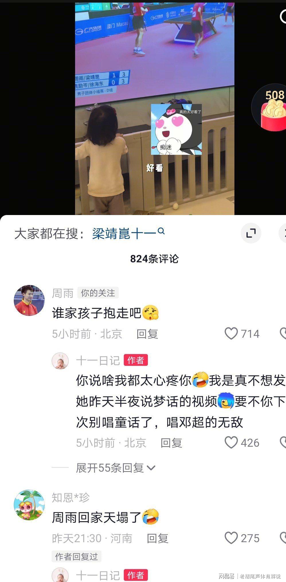 这次全运会小组赛,周雨和梁靖崑还打了一场男双的比赛,看这场比赛时,十一也看了,后面看到梁靖崑出来,她对着屏幕在喊“爸爸加油”,然后周雨媳妇说了好几次是梁叔叔加油,后面十一才喊的梁叔叔,看来是真的喜欢梁叔叔,梁叔叔也很稀罕周雨家闺女。周雨给他媳妇留言:“谁家孩子抱走吧。”周雨媳妇说:“你说啥我都心疼你。”十一和凉皮哥哥玩的也挺好,凉皮哥哥一看也是小暖男,二宝和梁靖崑像,也是不善言语,但是也喜欢和十一妹妹玩。