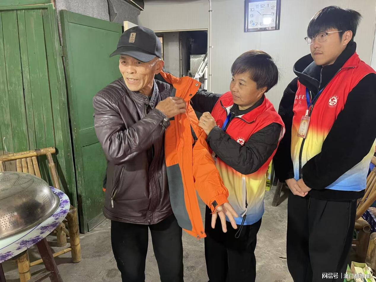 在困难户邱大爷家中,志愿者小心地帮他脱下旧外套,展开那件崭新的藏青色冲锋衣。“大爷,抬抬手,这衣服防风防雨,今年冬天穿着暖和。”志愿者一边轻声说着,一边仔细地为老人拉好拉链,整理好衣领。